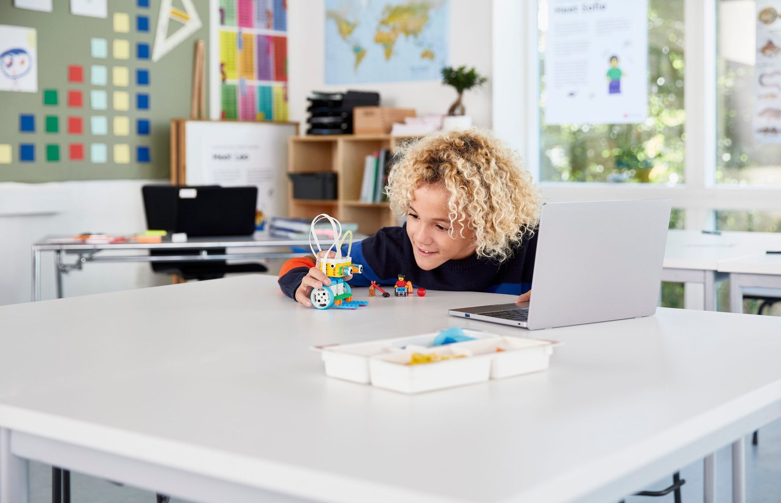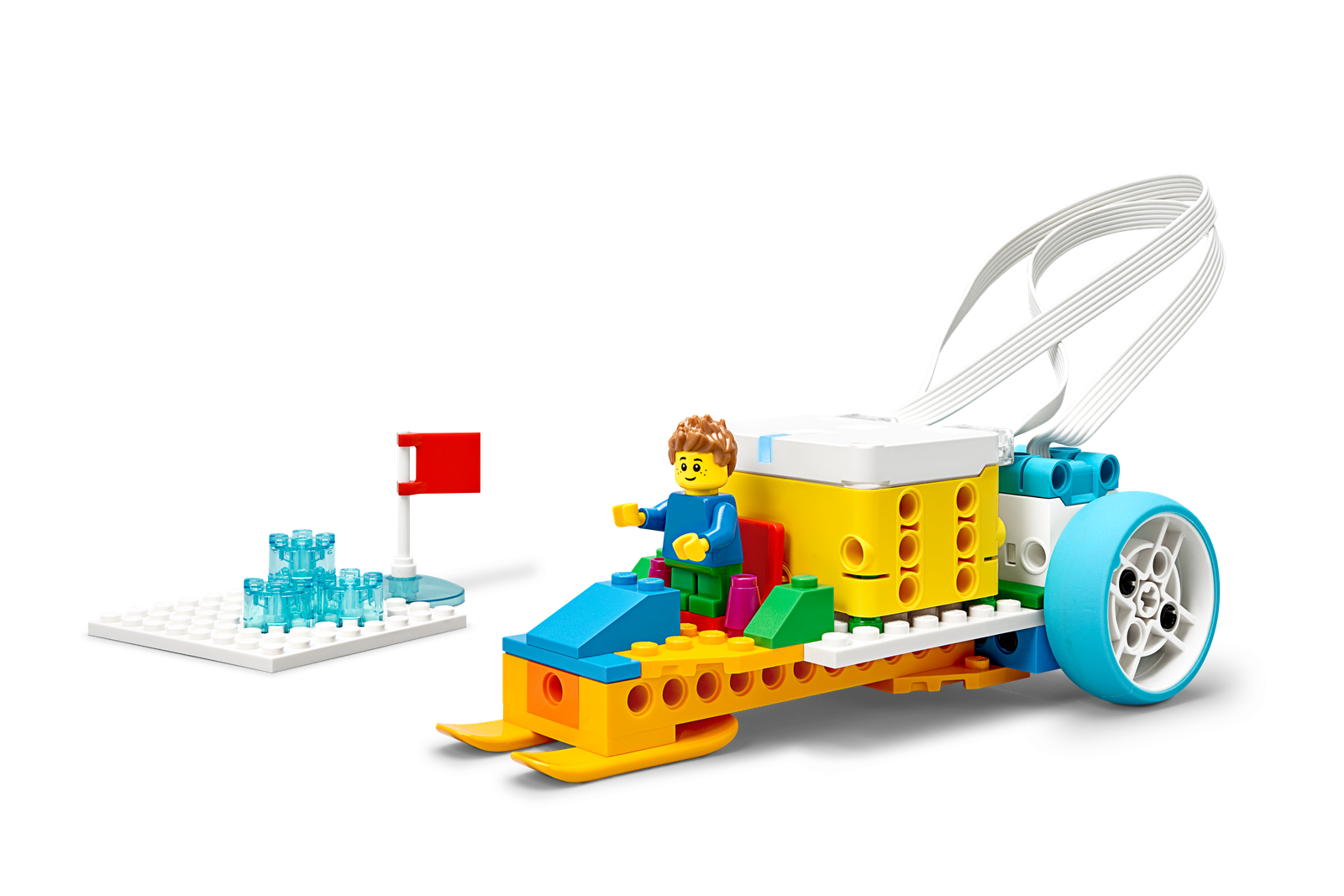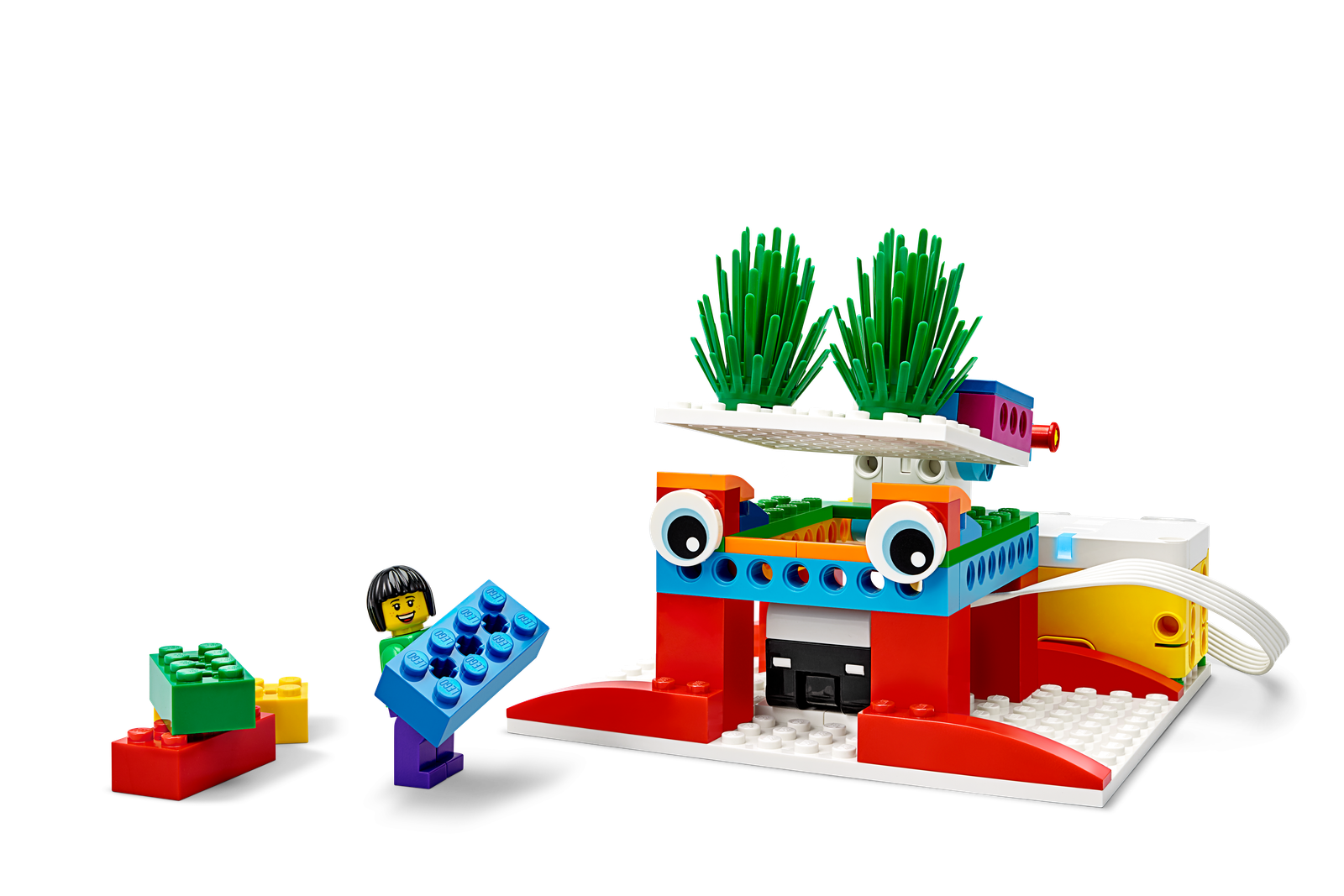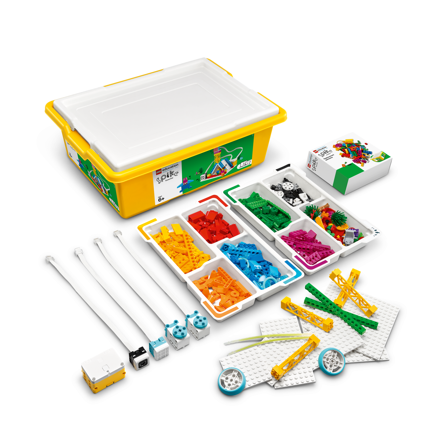 The SPIKE Essential Set includes 449 LEGO® elements, featuring 4 diverse minifigures, simple and intuitive hardware components, and a Smart Hub, all organized in a robust storage box with color-coded sorting trays.