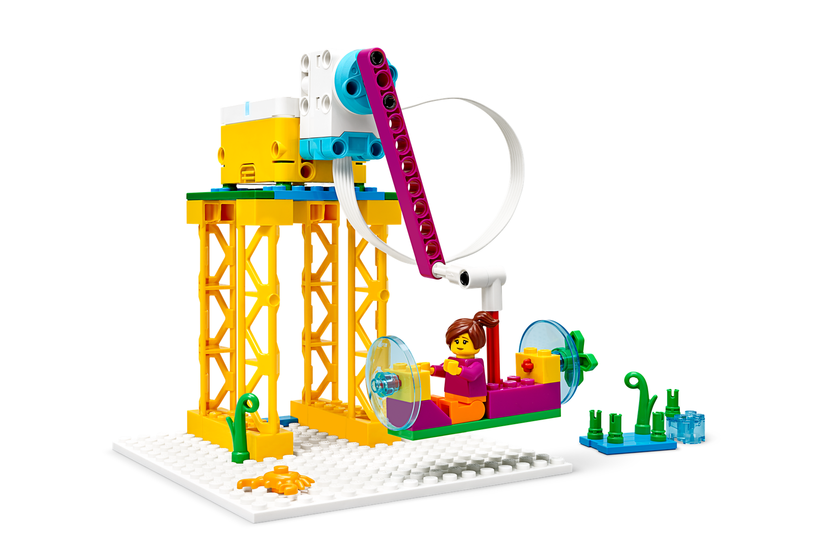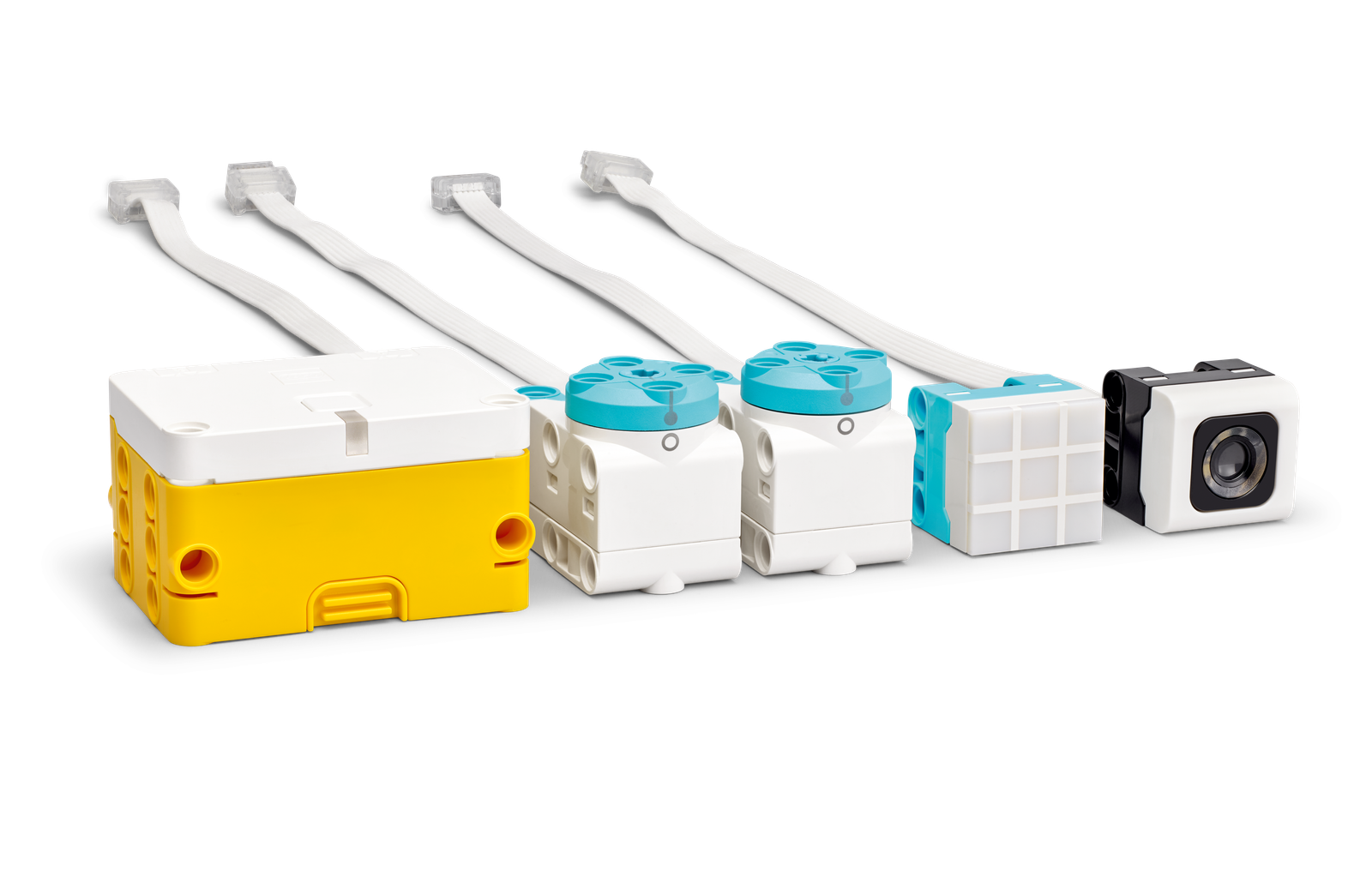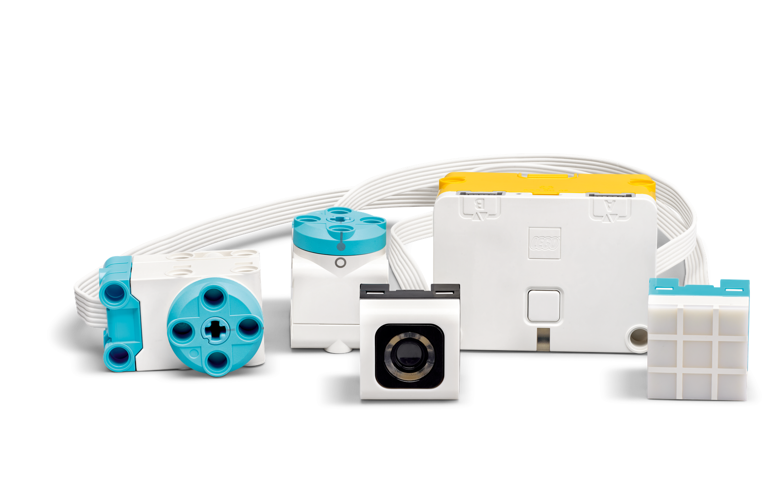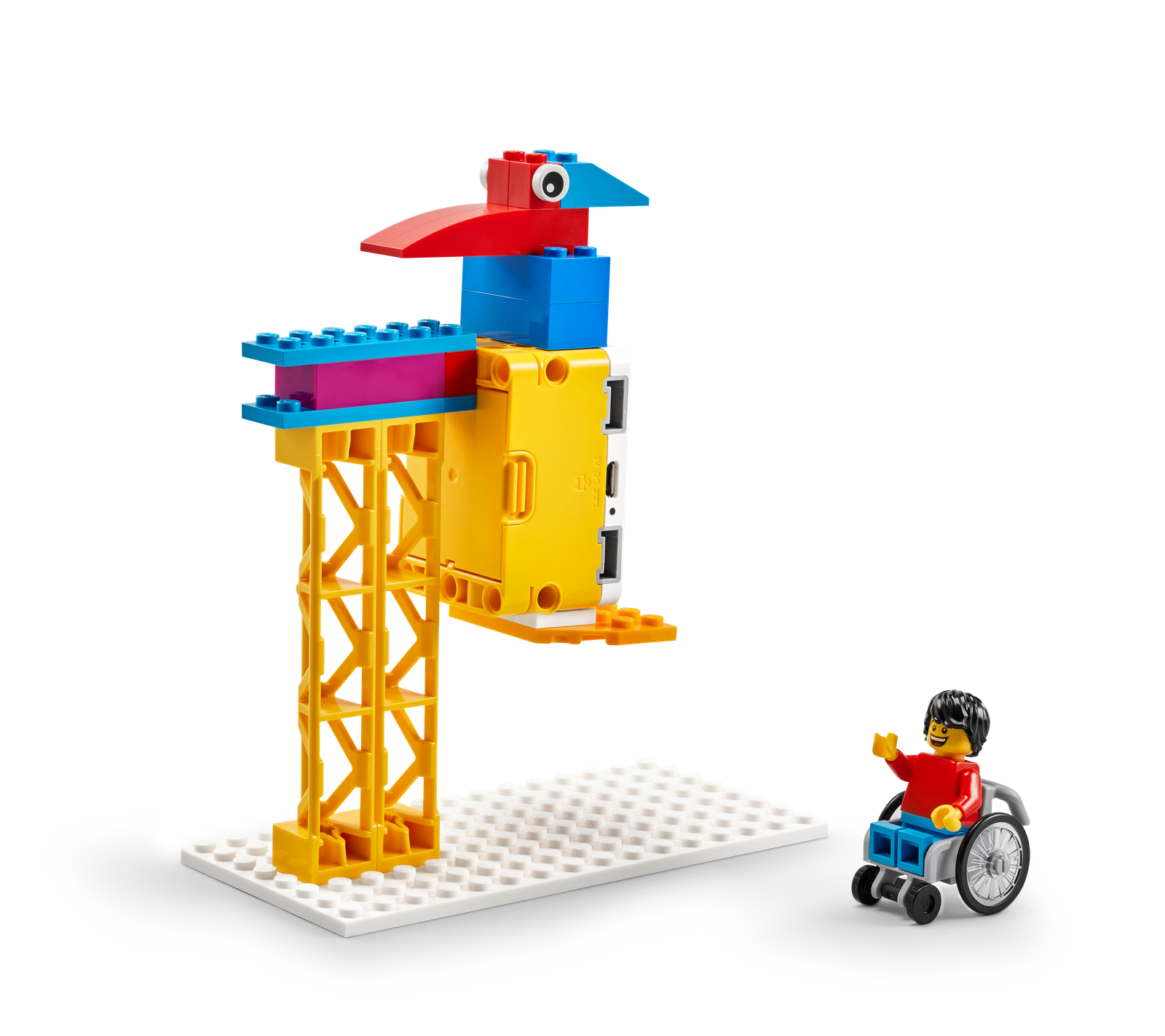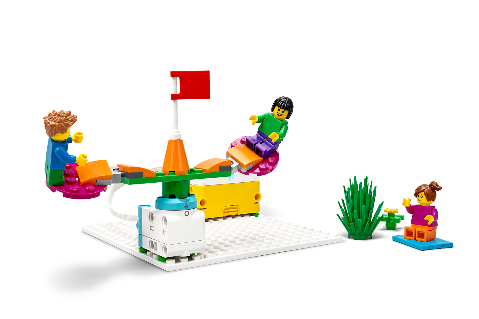 The SPIKE Essential Set includes 449 LEGO® elements, featuring 4 diverse minifigures, simple and intuitive hardware components, and a Smart Hub, all organized in a robust storage box with color-coded sorting trays.